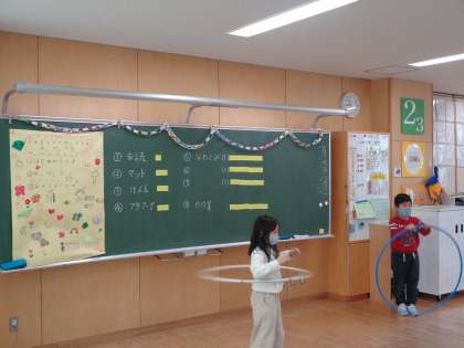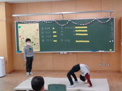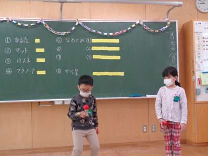 生活科の学習で入学してから、現在に至るまでを振り返り、自分ができるようになったことを発表しました。けん玉、フラフープ、マット等の技を披露し、見ている人も楽しみました。
