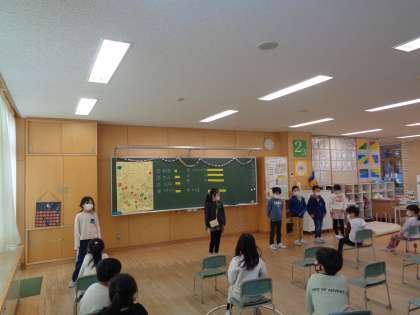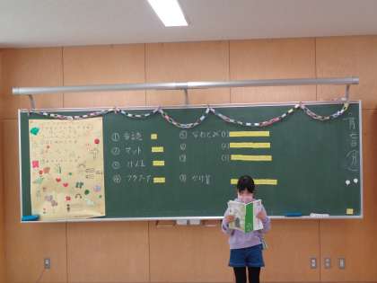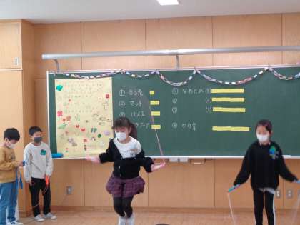 音読発表では、国語科「わたしは おねえさん」を句読点を意識しながら丁寧に読んでいました。九九の発表では、一人一人が一つずつ段を唱えた後にみんなで1の段を言いました。縄跳び発表では、できるようになった技を披露しました。練習したことを本番で発揮しました。