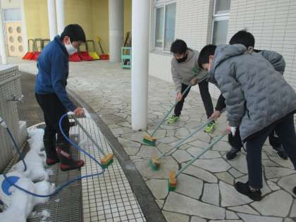 子供たちは、お世話になった学校への恩返しとして、普段はなかなか手が届かないサブアリーナの壁面の上方や玄関の水回り等を掃除しました。