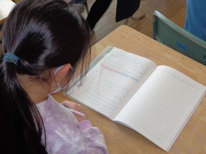 算数科では、文章問題の内容を整理するために、テープ図をノートに書いて考えました。子供たちは、全体と部分が分かるように赤や青で色分けをしたり、言葉で補ったりしました。学習したことを思い出しながら、取り組みました。