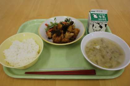 今日の献立は、ご飯、鶏肉とレバーのカレー風味、小松菜のナムル、たら汁、牛乳です。