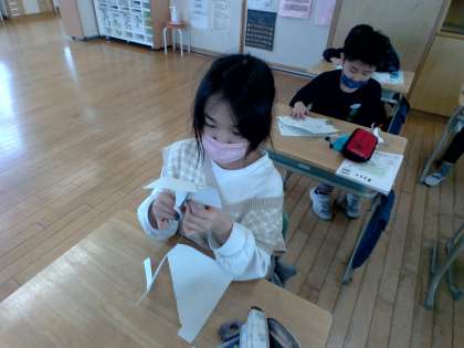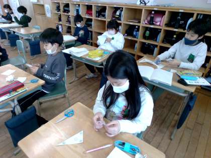 算数科「三角形を調べよう」の学習では、角の大きさについて調べました。1・2年生で学習した長さの比べ方を思い出しながら、重ねたり同じ物で比較したりしました。
