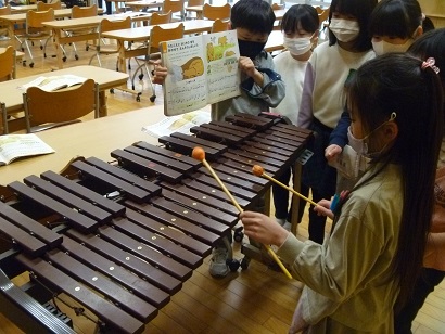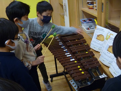 木琴で演奏することに挑戦しました。バチの持ち方や叩く場所を教えてあげたり、楽譜が見やすいように教科書を持ってあげたりするなど、協力して取り組んでいました。