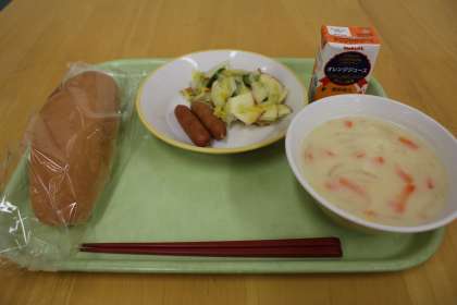 今日の献立は、米粉コッペパン、ウインナー、白菜とりんごのサラダ、コーンチャウダー、オレンジジュースです。