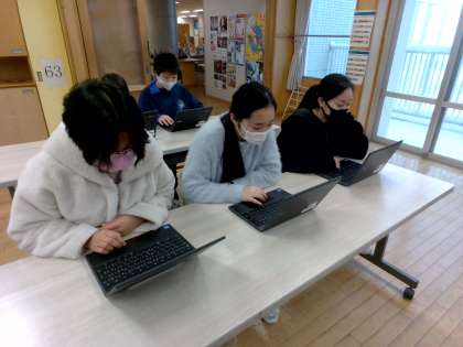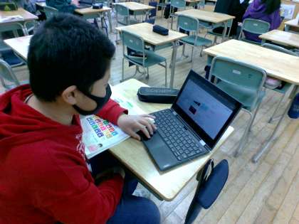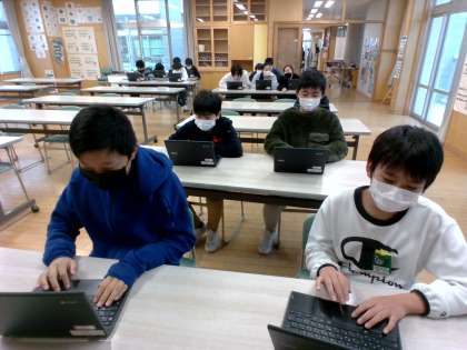 小学校理科で学んだことを生かし、「地球環境とどのようにかかわって生きていけばよいか」という学習課題で考えています。SDGsとも関連付け、調べ学習を進めています。欠席の友達とビデオ会議システムで話合いながら、資料をまとめている子供も見られました。