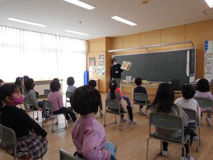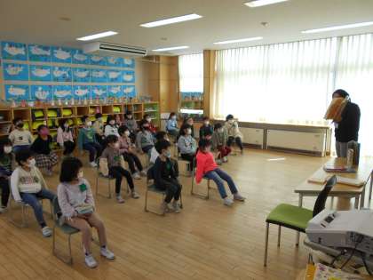 今日は、市立図書館の方が絵本の読み聞かせをしてくださいました。子供たちは、本の世界に入り込み、集中してお話を聞いていました。