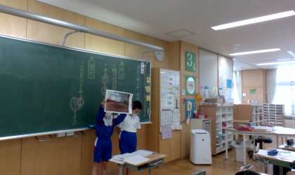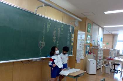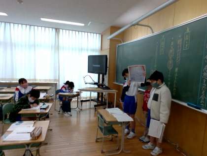 学校の自慢したい場所や活動について、グループ毎に発表しました。子供たちは、声の強弱や速さ、間の取り方を工夫したり、写真や絵を見せたりしながら、聞き手に伝わりやすいよう話していました。