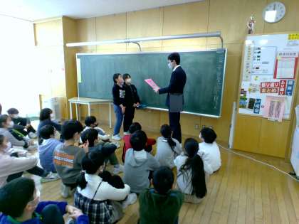 「学びのアシスト」事業で来てくださっている大学生の先生が、今日で最後の来校日となりました。4年生のお世話になったクラスが、ありがとう集会を開きました。