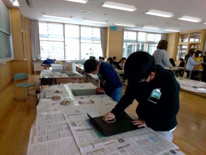 講師の先生に来ていただき、版画の刷り方を教えていただきました。子供たちは、インクを慎重に付けたり、バレンで一生懸命こすったりしていました。自分の作品がきれいに出来上がって、とても嬉しそうでした。