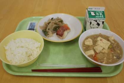 今日の献立は、ご飯、赤魚の塩焼き、れんこんのきんぴら、豆腐と野菜のうま煮、のり佃煮(小袋)、牛乳です。