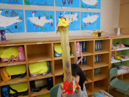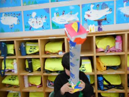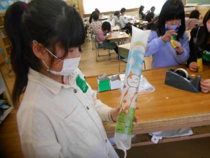 1年生は図画工作科「にょきにょきとびだせ」の学習で、ふくらむ形に合うものをみつけて、ロケットがとぶようにしたり、ねこのしっぽがぴんとのびるようにしたりしていました。