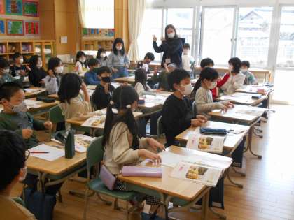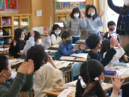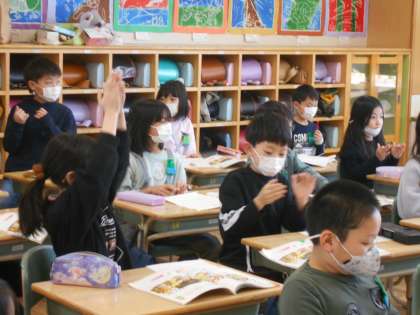2年生は音楽の学習をしていました。いろいろな楽器の音を聞き分けて、楽器を演奏している人になりきって、曲に合わせて楽しそうに体を動かしていました。