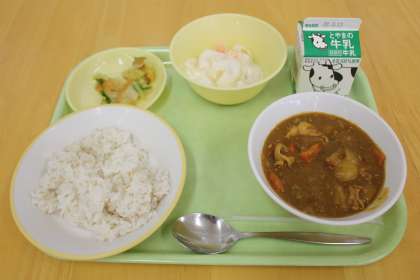 今日の献立は、麦ご飯、カレーライス、福神和え、フルーツヨーグルト、牛乳です。