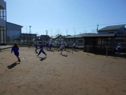 3月に入り、雪が溶け、お日様も顔を出し、ようやく春らしくなってきました。ずっと外に出たがっていた子供たちは、我先にと外に飛び出し、楽しくおいかけっこをしました。