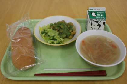 今日の献立は、米粉コッペパン、えびとひよこ豆のオリーブオイル炒め、そえ野菜、ポテトスープ、牛乳です。