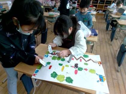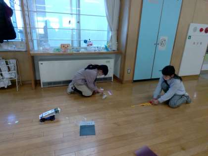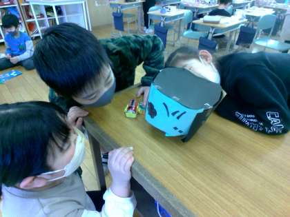 風やゴム、電気や磁石等について、これまでに学習したことを生かしておもちゃをつくっています。子供たちは、友達と相談したり実際に試したりしながら、活動していました。