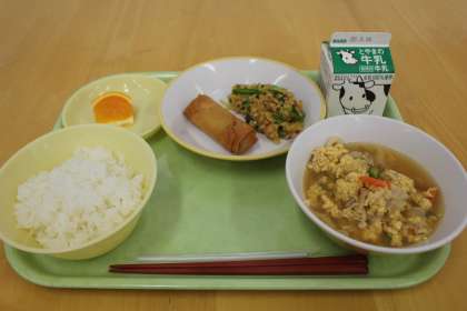 今日の献立は、ご飯、親子煮、春巻き、納豆和え、清見オレンジ、牛乳です。