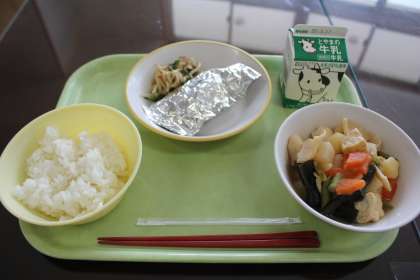 今日の献立は、ご飯、さばの銀紙焼き、ごまひたし、関東だき、牛乳です。
