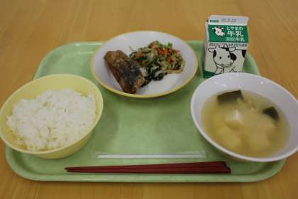 今日の献立は、ご飯、さかなのかば焼き、はりはり和え、みそ汁、牛乳です。