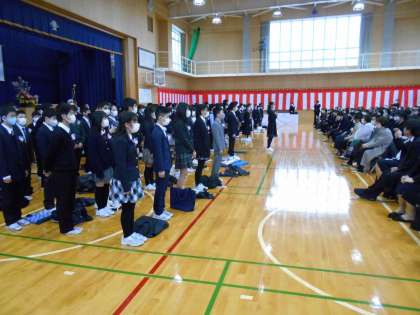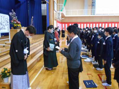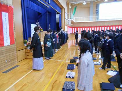 卒業生が、教職員や地域の方々、保護者の方々に向けて、感謝の言葉を述べました。担任の先生への感謝の言葉の時に、感極まる担任と卒業生の姿がとても印象的でした。