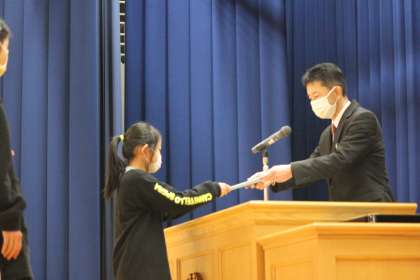 修了証授与では、「第〇学年」の呼名に対して、学年の児童全員で「はい!」と元気に返事をし、その学年の児童代表が校長先生から修了証を受け取りました。