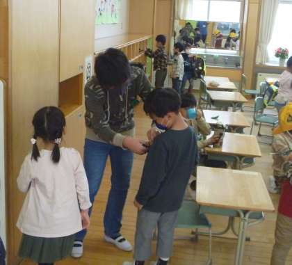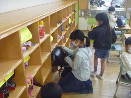 1年生の朝の準備のお手伝いをしました。名札を付けてあげたり、ランドセルの準備をしてあげたりと、最高学年として活躍していました。