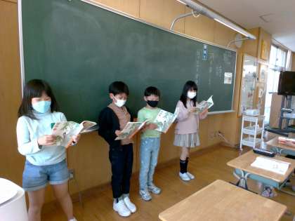 国語科の学習では、詩「どきん」をグループで音読しました。言葉のリズムを楽しみながら音読しています。