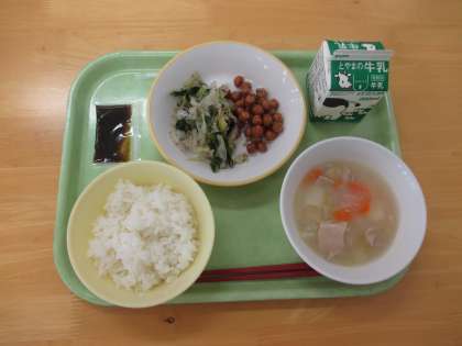 今日の献立は、ごはん、ひよこ豆のフライビーンズ、ゆかりあえ、豚汁、のりつくだに、牛乳です。