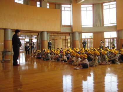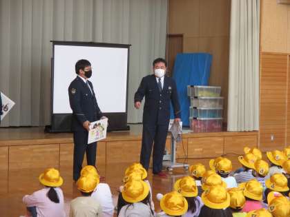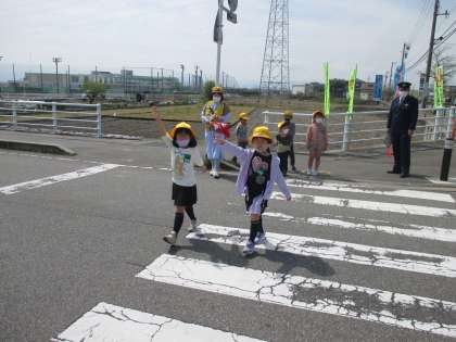 1年生が、交通安全教室に参加しました。警察署の方々の話を聞いて、横断歩道や道路を歩くときのルールを勉強した後、実際に登下校の通学路を安全に歩けるかを確認しました。自分の命は自分で守ろうと、真剣に取り組んでいました。