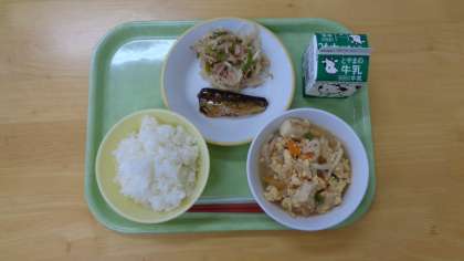 今日の献立は、ごはん、いわしの梅煮、はりはりソテー、厚揚げのにしきとじ、牛乳です。