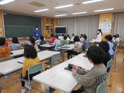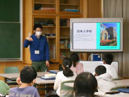 新しく来られた外国語専科の先生と外国語の学習を行いました。先生の自己紹介を聞いたり、1年間の学習の見通しをもったりしました。