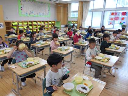 コロナ感染予防のため、全員が前を向いて静かに食べています。