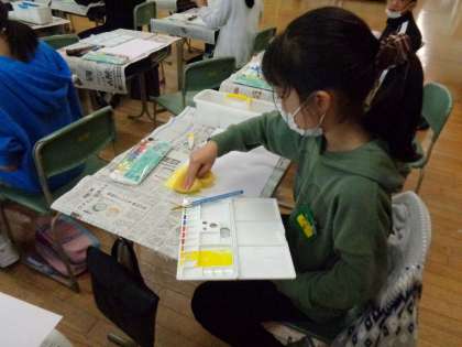 心に思い描いたものを、水彩を使って思いのままに表現しました。スポンジやブラシを使って自由に描き表すことを楽しみました。