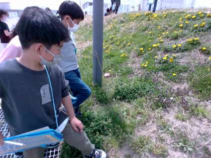 新しく始まった理科の学習では、身近な春の自然を探す学習に取り組んでいます。グラウンドの周りの芝生には、春の生き物がたくさんいました。子供たちは、より多くの生き物を見つけようと真剣に取り組んでいました。