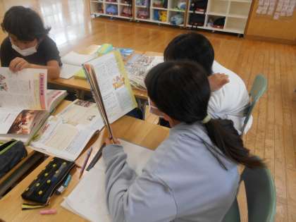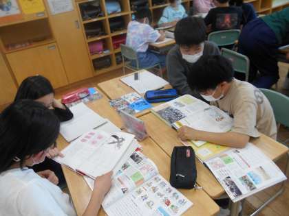 落ち着いて学習に意欲的に取り組んでいます。社会科では、グループ毎に暮らしと日本国憲法のつながりについて、調べ学習に取り組みました。