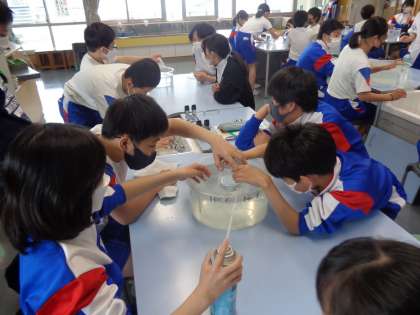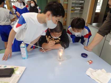 理科では、物を燃やす働きのある気体について学習しています。集気瓶の中に気体を集め、火の付いたろうそくを入れて燃え方を観察しました。