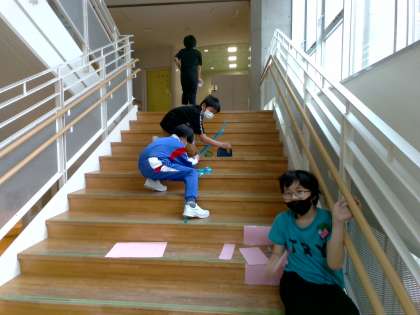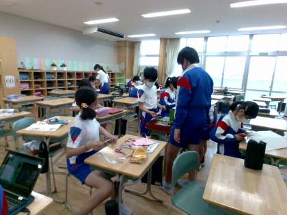 図画工作科「ここから見ると」では、角度を変えると作品が完成するように考えながら活動しています。2つの絵や複数の紙テープが1つの作品となるよう試行錯誤しています。