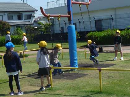 子供たちは、「ゆらゆら揺れる長い板がお薦めだよ。だって、たくさんの友達と揺れて遊ぶことができるから。」「大きい木の下のベンチがお薦めだよ。だって、風が吹いて、気持ちよく休むことができるから。」など、たくさんお薦めを見付けていました。