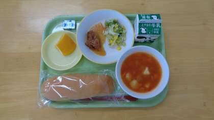 今日の献立は、コッペパン、牛乳、照り焼きチキン、コールスローサラダ、ミネストローネ、ポケットチーズ、甘夏ミカンです。