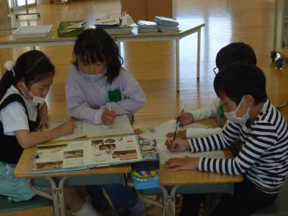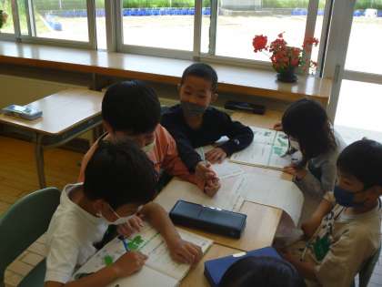 「苗を植えた後、たっぷり水をあげるとよい、と本に書いてあるよ」「お母さんから、支柱を立てて苗を支えるといいって聞いたよ」など、これからの育て方について本で調べたり家の人に聞いたりしたことを、友達と話していました。