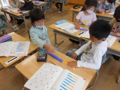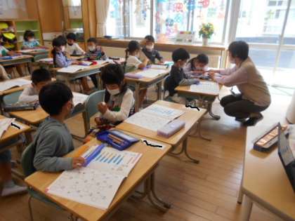 今日は、算数の学習を頑張りました。10個のブロックをいくつか隠し、「いくつ隠したでしょう?」と友達と問題を出し合い、10の合成の学習をしました。友達と仲良く学習できることがとても楽しいようで、意欲的に取り組んでいました。