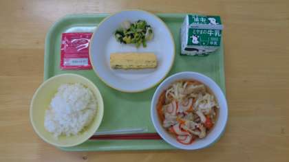 今日の献立は、ご飯、牛乳、かやくうどん、えごま入り卵焼き、おひたし、しそかつおふりかけです。