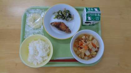 今日の献立は、ご飯、牛乳、魚の米粉揚げ、ゆかり和え、筑前炊き、冷凍パインです。