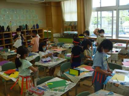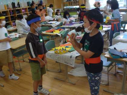 「ぼく、忍者に変身したいな。忍者のハチマキに手裏剣の飾りをつけたいな。」「わたしは、猫に変身したいな。猫の柔らかい毛の感じを出したいな。」など、友達と話し合いながら、楽しく作っていました。