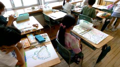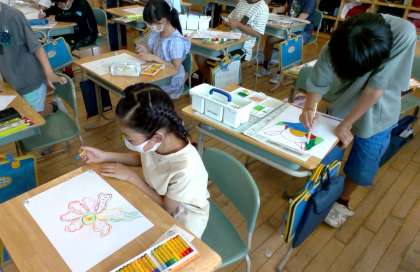 図画工作科の時間に「まぼろしの花」を描きました。子供たちは「こんな色の形の花があったらいいな」「こんな色や模様の花があると面白いな」と想像を膨らませながら、丁寧に作品を仕上げていました。