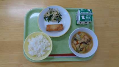 今日の献立は、ご飯、牛乳、春巻き、塩ナムル、八宝菜です。