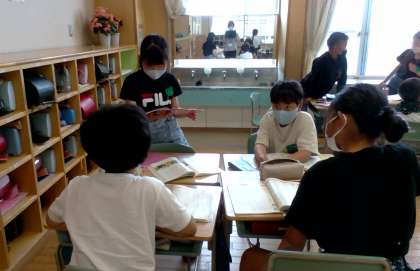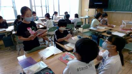 「一つの花」を詳しく読んで考えが変わったところを中心に感想をまとめま、書いた感想を班で読み合いました。子供たちは、自分と友達との感じ方や考え方の違いに気付いている様子でした。
