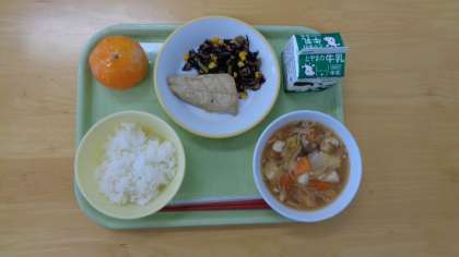 今日の献立は、ご飯、牛乳、鰆の西京焼き、ひじきのソテー、豆腐の野菜あんかけ、冷凍ミカンです。