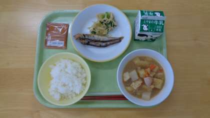 今日の献立は、ご飯、牛乳、大豆ふりかけ、ししゃもの唐揚げ、はりはり和え、鶏肉とじゃがいものごま煮です。
