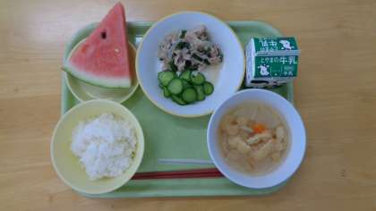 今日の献立は、ご飯、牛乳、豚肉の塩麹炒め、きゅうりもみ、味噌汁、スイカです。